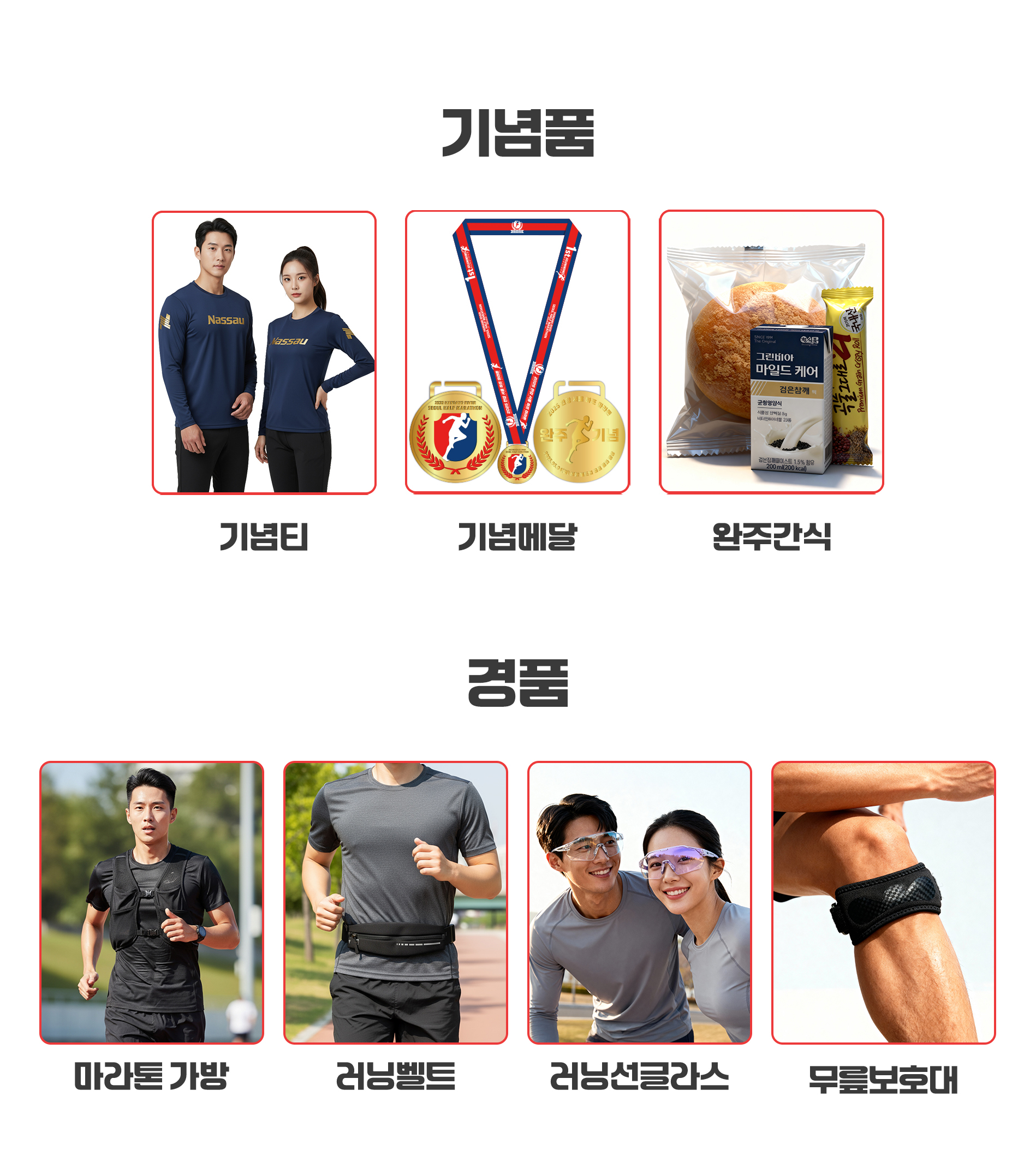 [ 기념티셔츠, 완주메달, 기록증(하프/10km), 간식(빵,음료수) ]